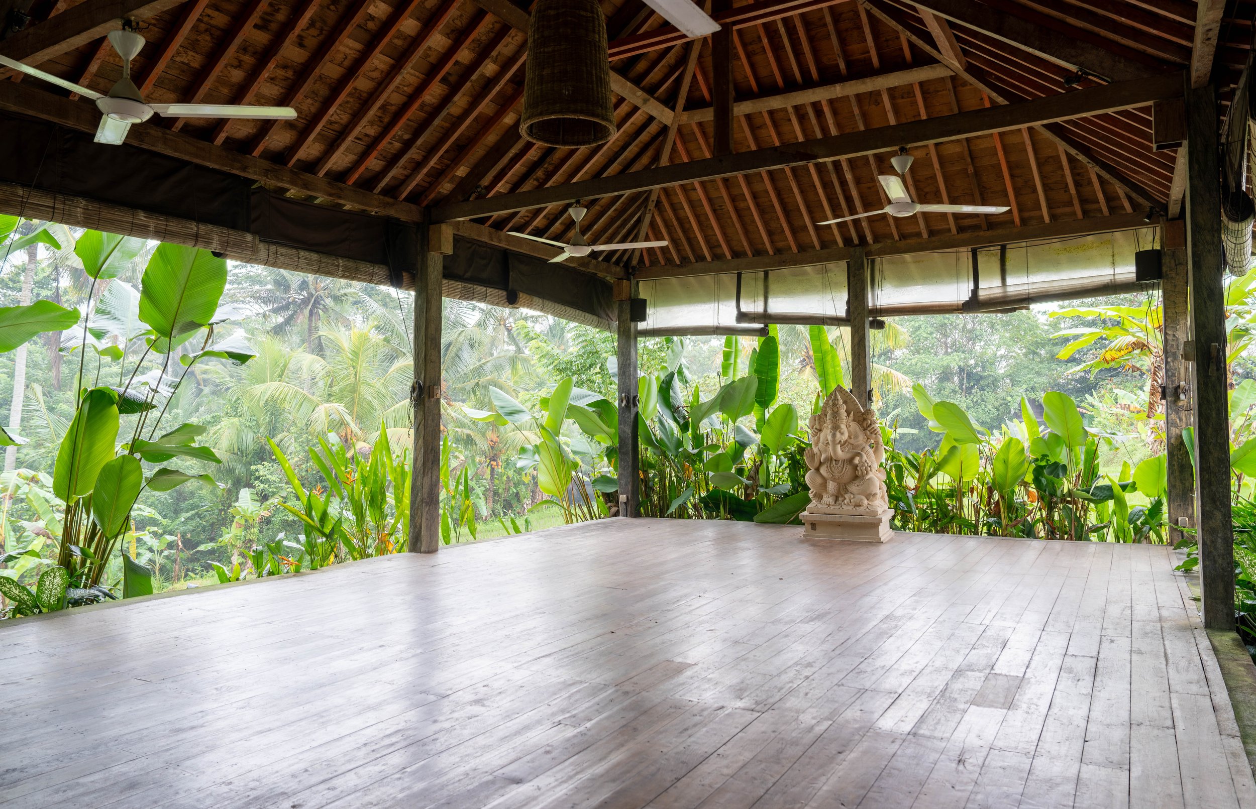 beautiful open-air yoga shala equipped with yoga mats, blocks, belts, bolster and blankets - amidst the greenery and rice fields.
