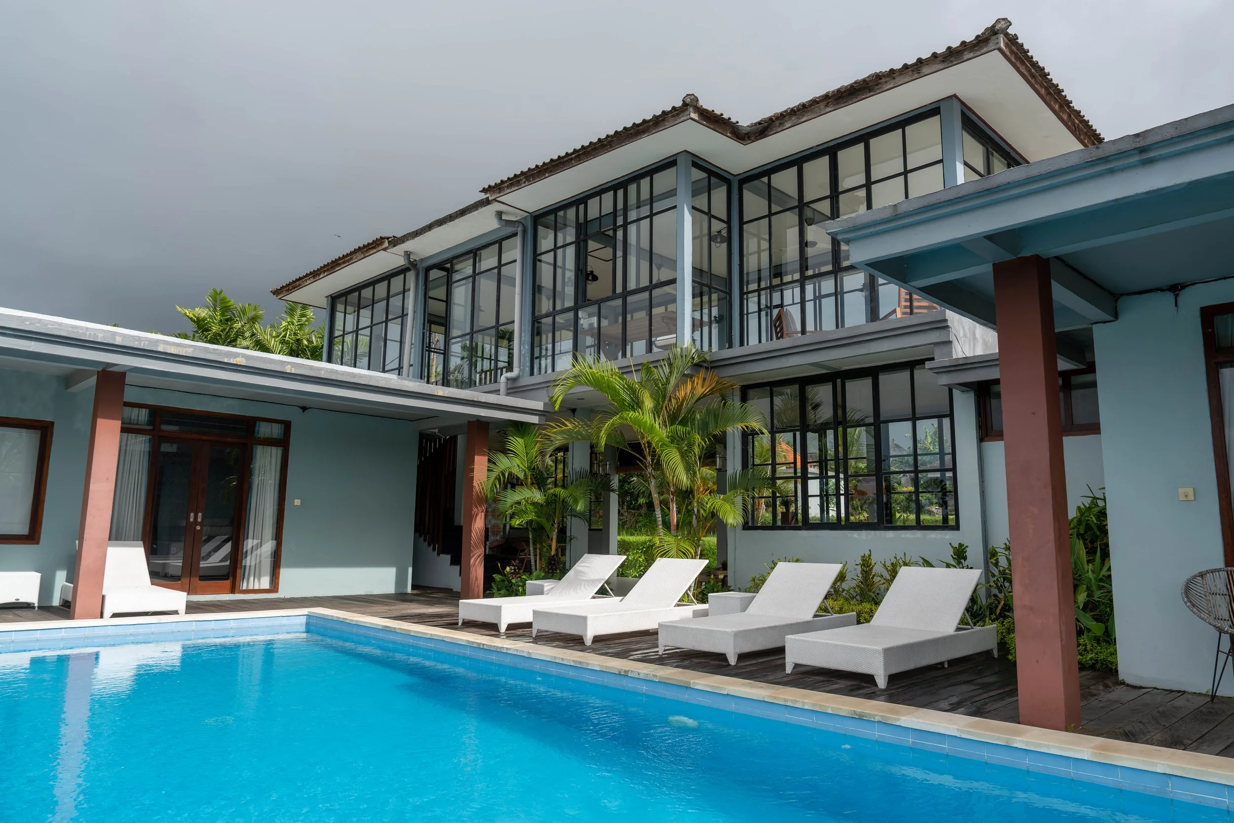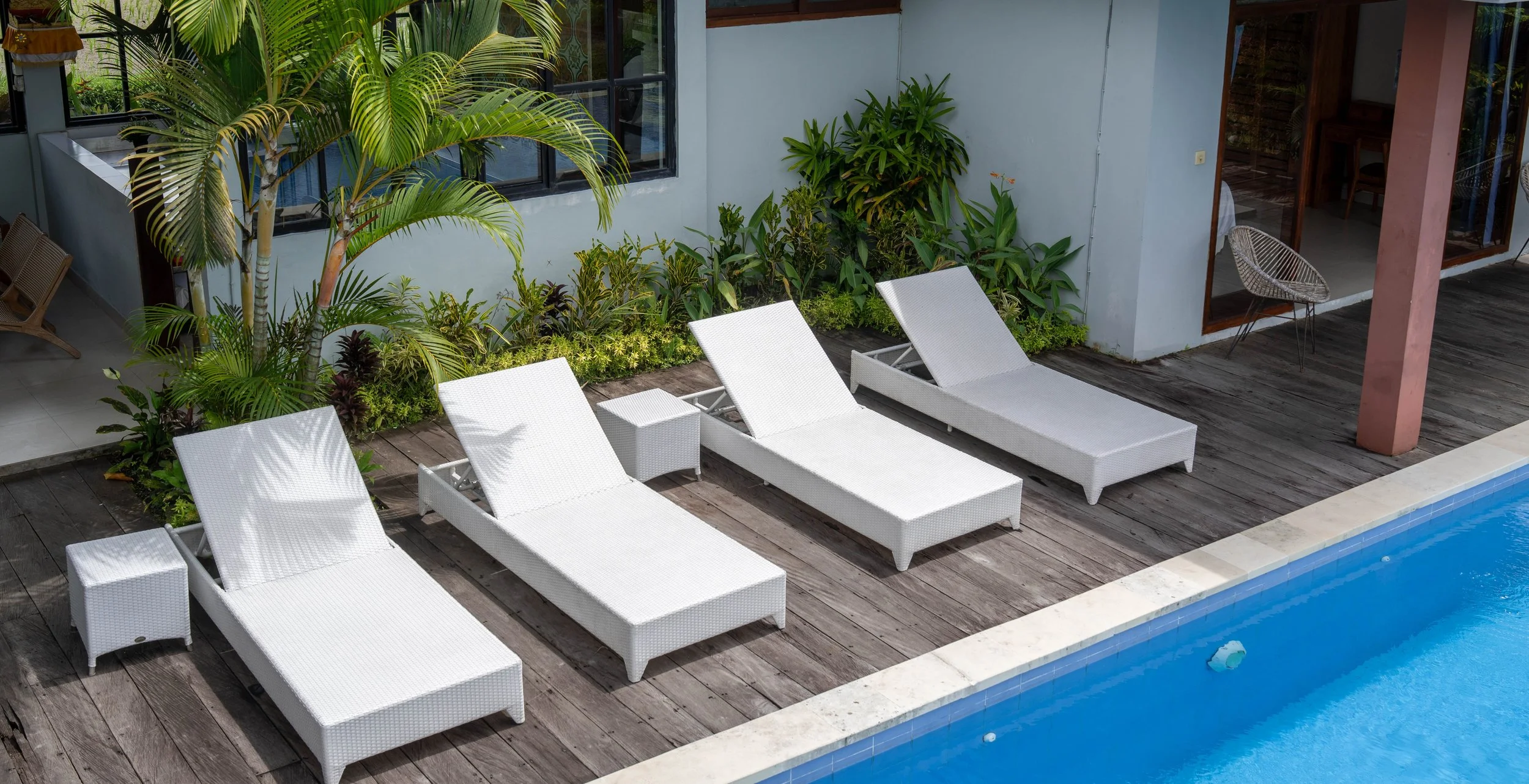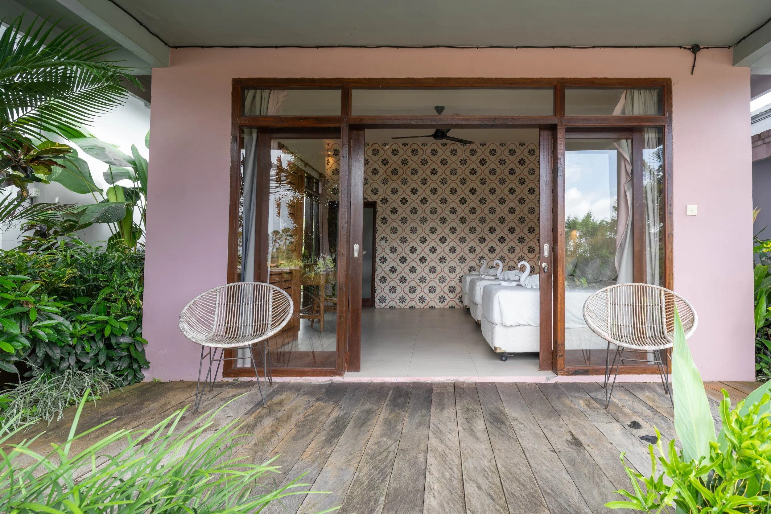 Each room is steps away from surrounding rice fields and opens onto a private deck with outdoor seating. All rooms are independent and feature a unique hand-made tile wall. Recycled timber handpicked furniture, fine cotton sheets, and authentic Balinese toques are combined with European comfort. Every room is equipped with a ceiling fan, organic shower products, and a hand dryer. Villas are available in twin share, triple share, and private room options.