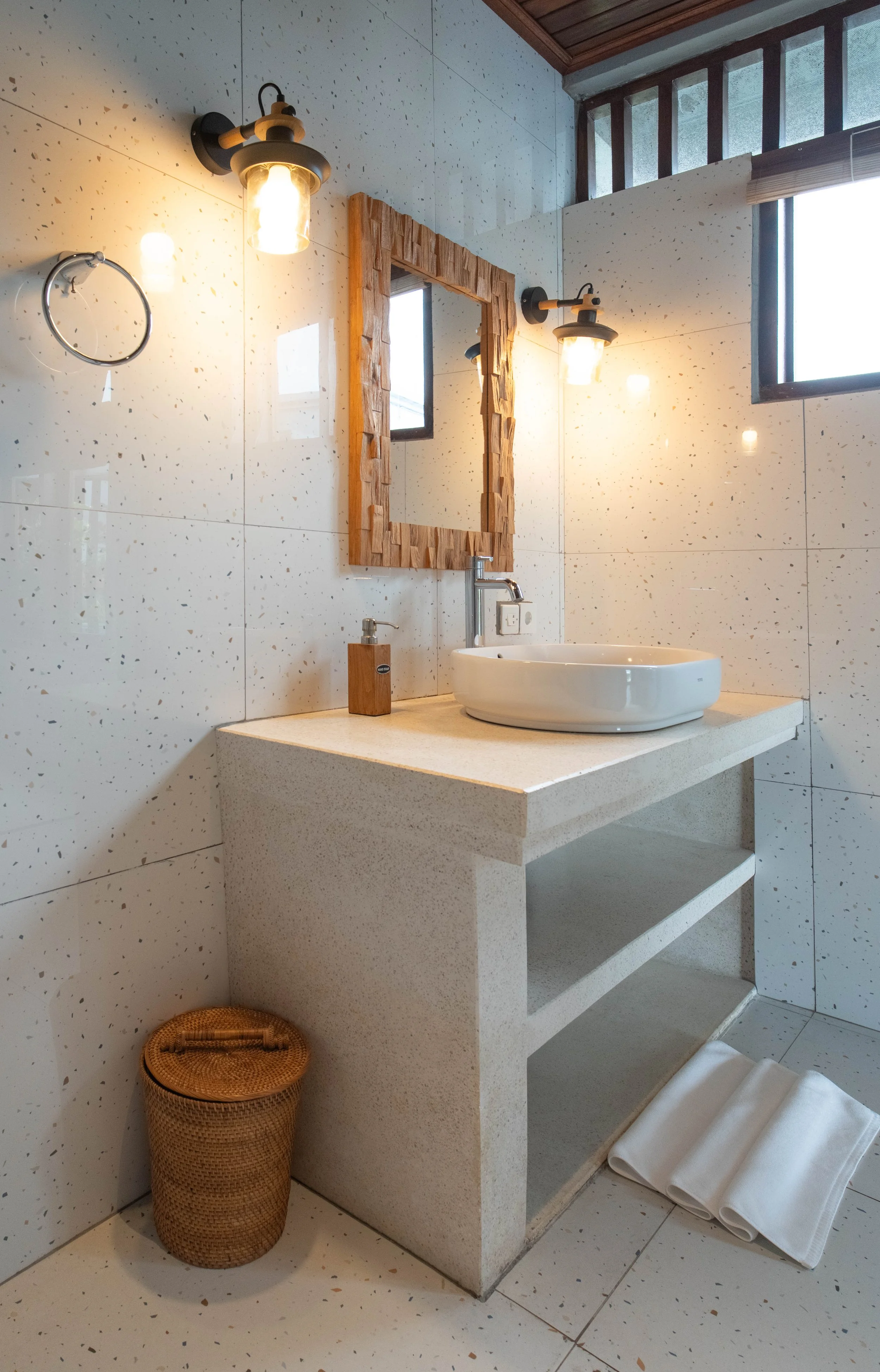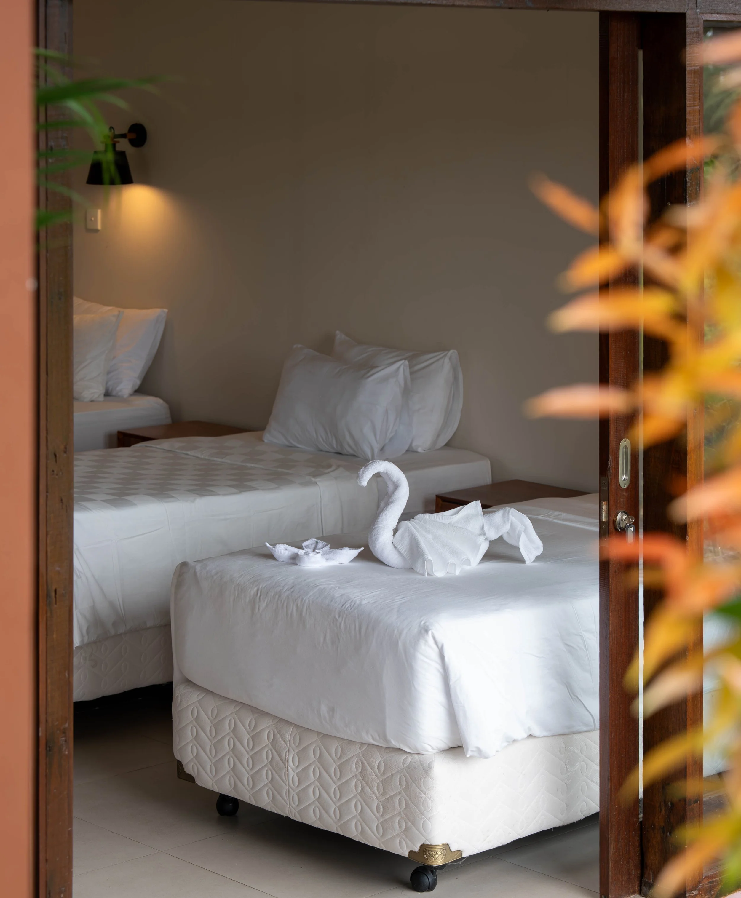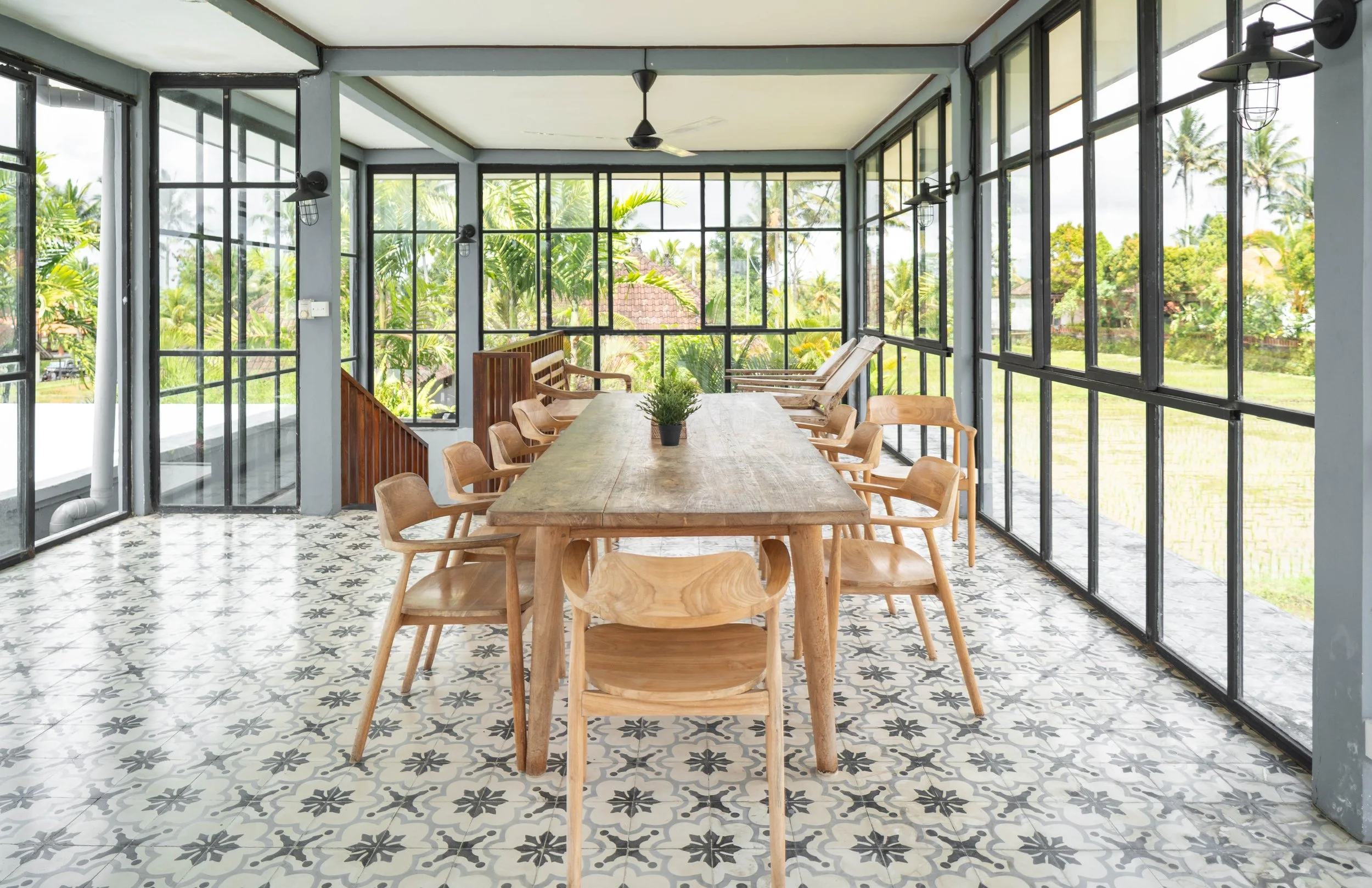Each room is steps away from surrounding rice fields and opens onto a private deck with outdoor seating. All rooms are independent and feature a unique hand-made tile wall. Recycled timber handpicked furniture, fine cotton sheets, and authentic Balinese toques are combined with European comfort. Every room is equipped with a ceiling fan, organic shower products, and a hand dryer. Villas are available in twin share, triple share, and private room options.